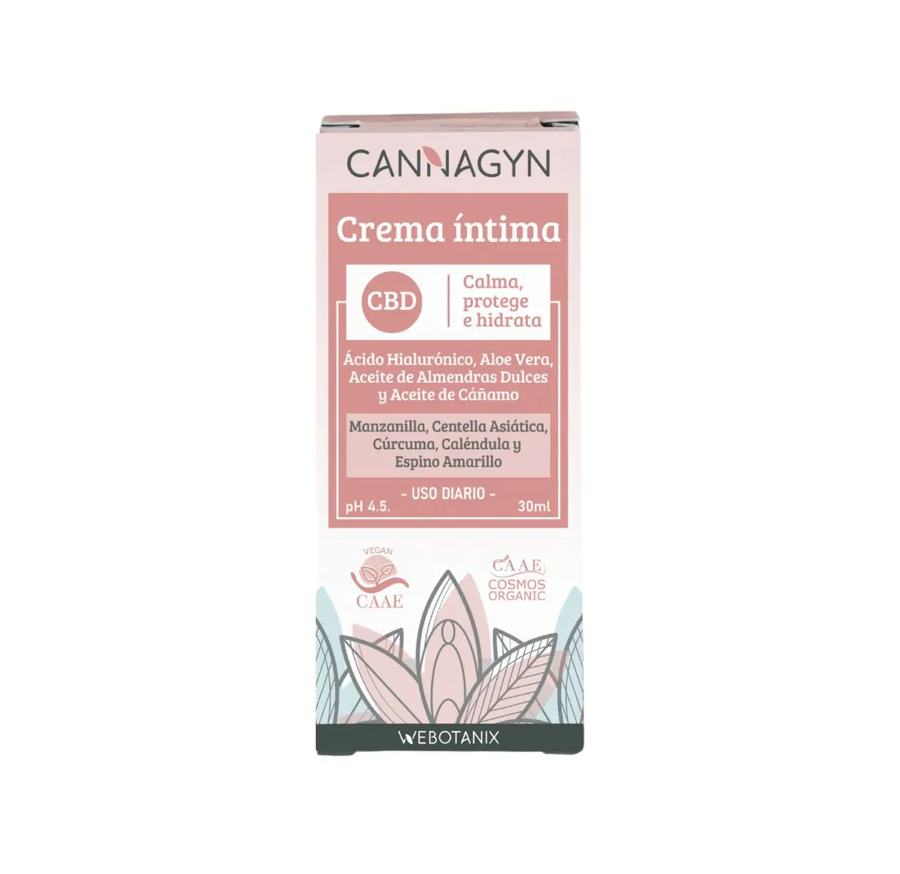 La crema íntima CANNAGYN hidrata y refuerza la barrera natural de la piel. Presenta una potente acción calmante que devuelve el confort y la suavidad a tu zona íntima. Contiene activos hidratante que favorecen la lubricación natural de la zona. Respeta el equilibrio fisiológico de la zona. [pH 4.5]