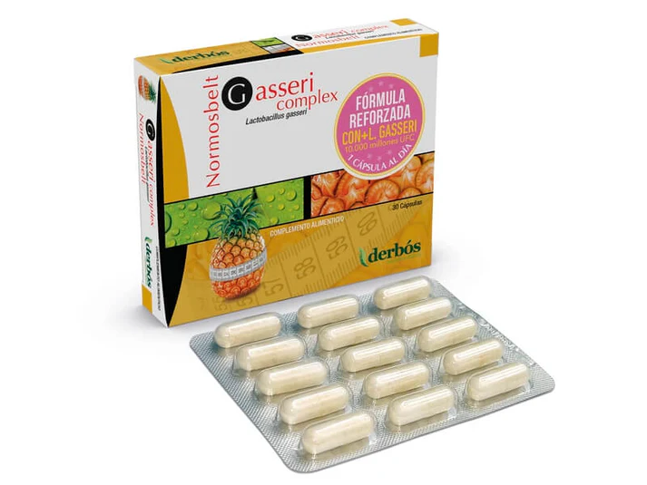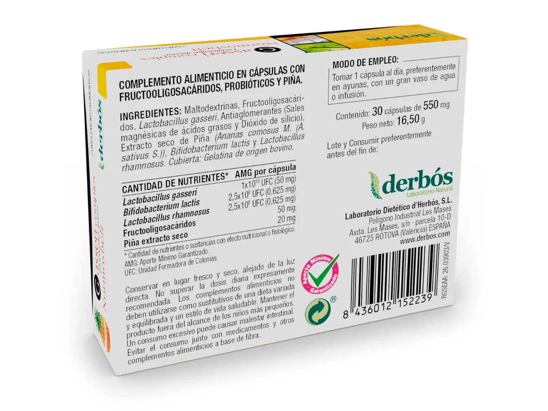 Probióticos total 10.000 millones ufc, Lactobacillus gasseri 3.000 millones ufc, Lactobacillus Rhamnosus 250 millones ufc, Bifidobacterium lactis 250 millones ufc, Fructooligosacáridos 50mgrs., y Piña 50mgrs.
