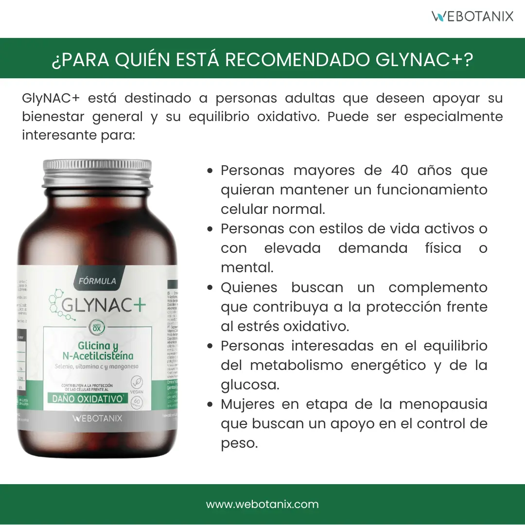 GlyNAC+ está destinado a personas adultas que deseen apoyar su bienestar general y su equilibrio oxidativo. Puede ser especialmente interesante para: