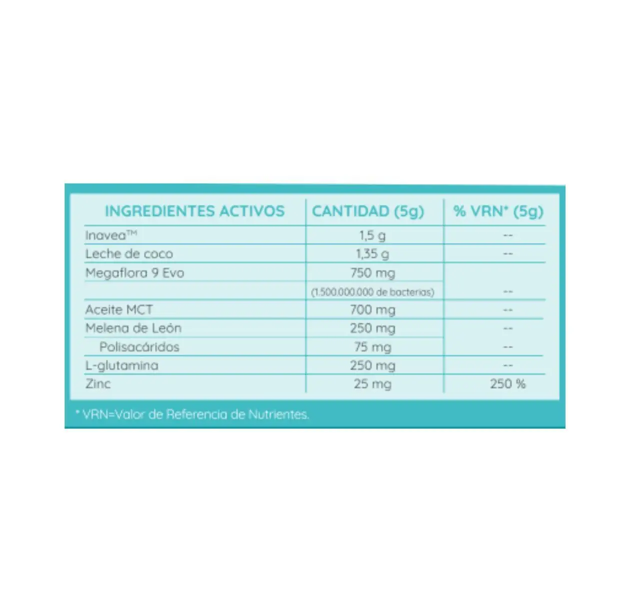 Ingredientes: InaveaTM pulpa ecológica del fruto de Baobab (Adansonia digitada L) y goma ecológica de Acacia (Acacia seyal Delile), leche de coco en polvo ecológica, Megaflora 9 Evo**, triglicéridos de cadena media (MCT) de aceite de coco, extracto seco de melena de León (Hericium erinaceus/ cuerpo fructífero), L-glutamina, maltodextrina de tapioca ecológica, gluconato de zinc.