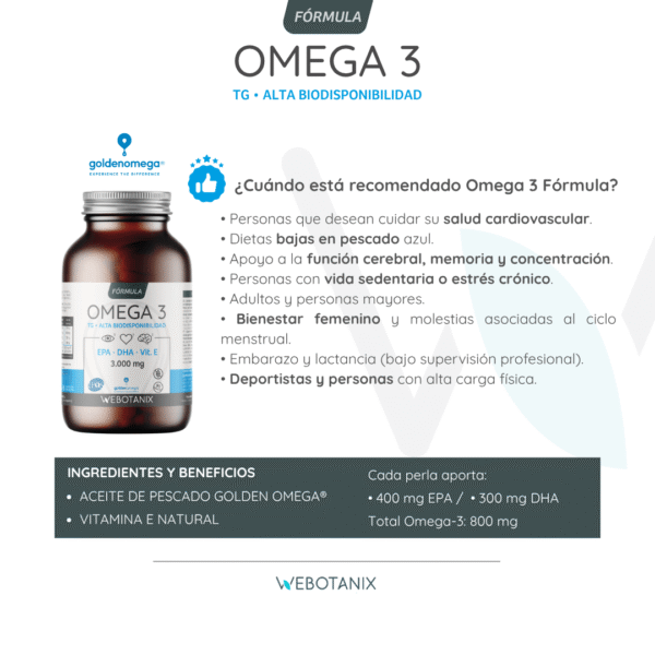 Omega 3 Fórmula es un complemento alimenticio a base de aceite de pescado de alta pureza Golden Omega® y vitamina E natural formulado para cuidar la salud cardiovascular, cerebral, visual y metabólica y proteger frente a la oxidación. Certificado IFOS.