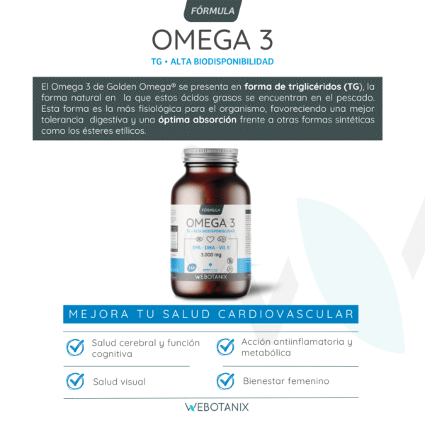 - Aceite de pescado Golden Omega®: Fuente de ácidos grasos omega-3 de alta calidad que contribuyen a la salud cardiovascular, la función cerebral y ocular, y al mantenimiento de articulaciones y bienestar general.