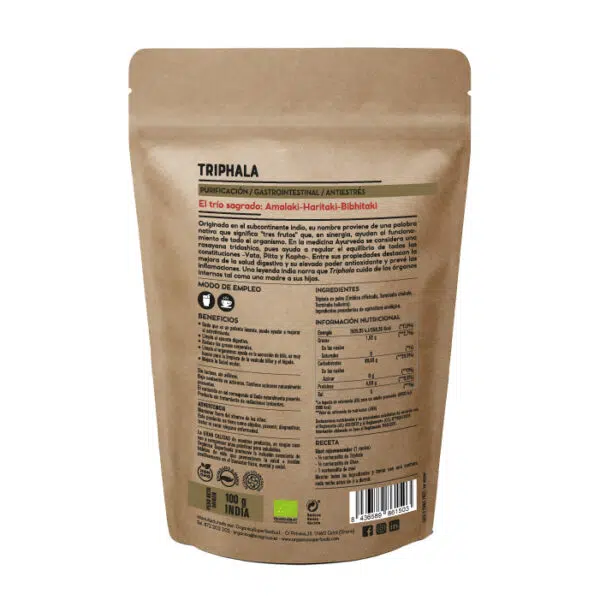 INGREDIENTES: 100% Triphala en polvo (Emblica officinalis, Terminalia chebula,Terminalia bellerica) procedente de cultivo ecológico.