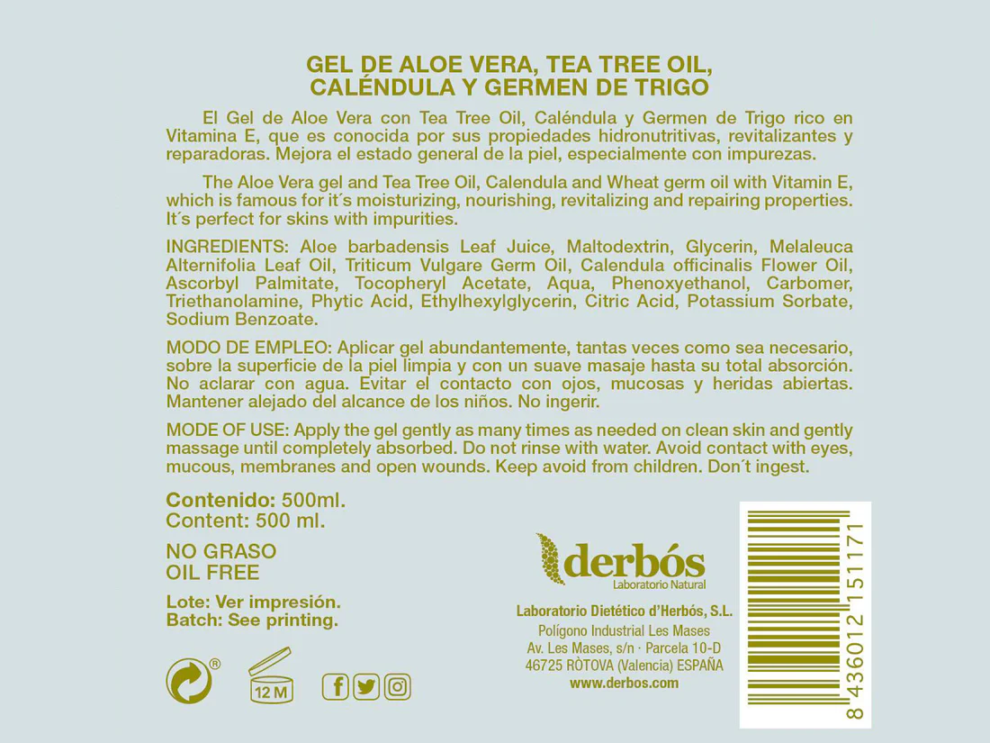 El Gel de Aloe Vera con Aceite del Árbol del té, Caléndula y Germen de trigo rico en Vitamina E, está indicado especialmente para pieles con impurezas o agredidas por microorganismos.